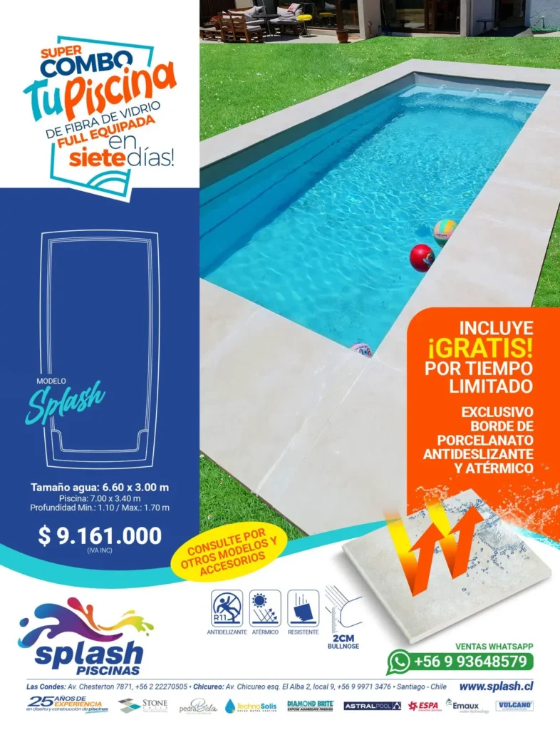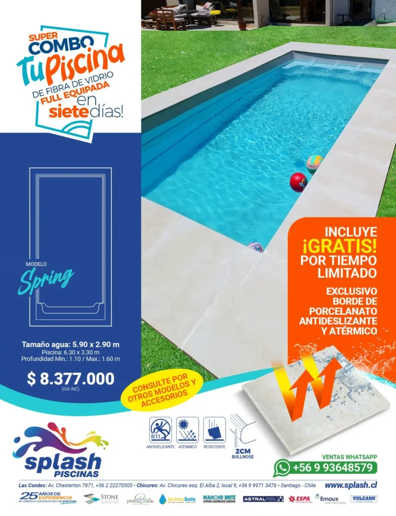 Escoge entre tres modelos: Summer, Spring y Splash Todos diseños de calidad, terminaciones y estética incomparable que incluyen un completo equipamiento para una funcionalidad total (traje de baño en mano). Fabricadas en fibra de vidrio (PRFV), material de textura suave. Resistente y flexible (antisísmico), 100% impermeable de fácil limpieza e higiénico (antihongos) que no requiere pintura periódica.